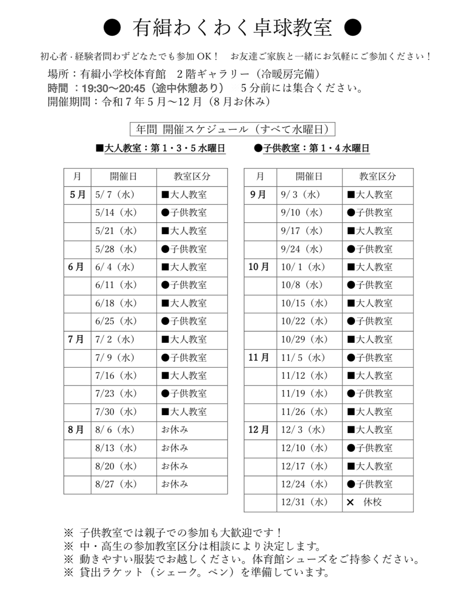 - 天候や学校行事などにより、教室の中止及び内容を変更する場合があります。